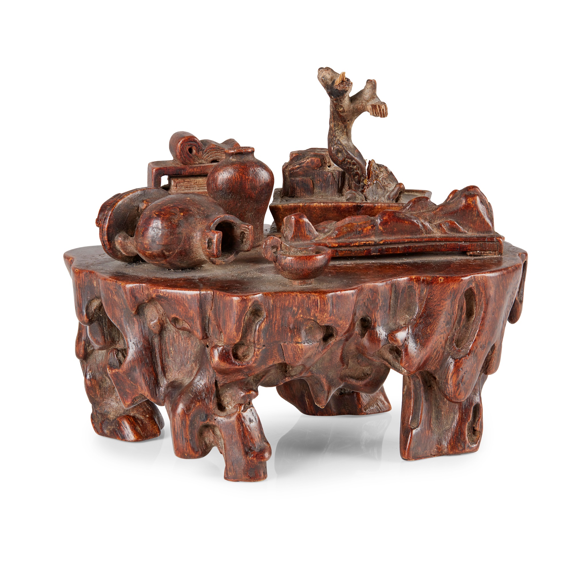 the desk with natural burled sides supported on four feet, the flattened top with miniature bogu motif- an arrangement of hundred antiques, including a tripod censer on a stand lying down, a meiping vase before a book stack, a bonsai and rockwork before a boulder, and a bowl with spoon