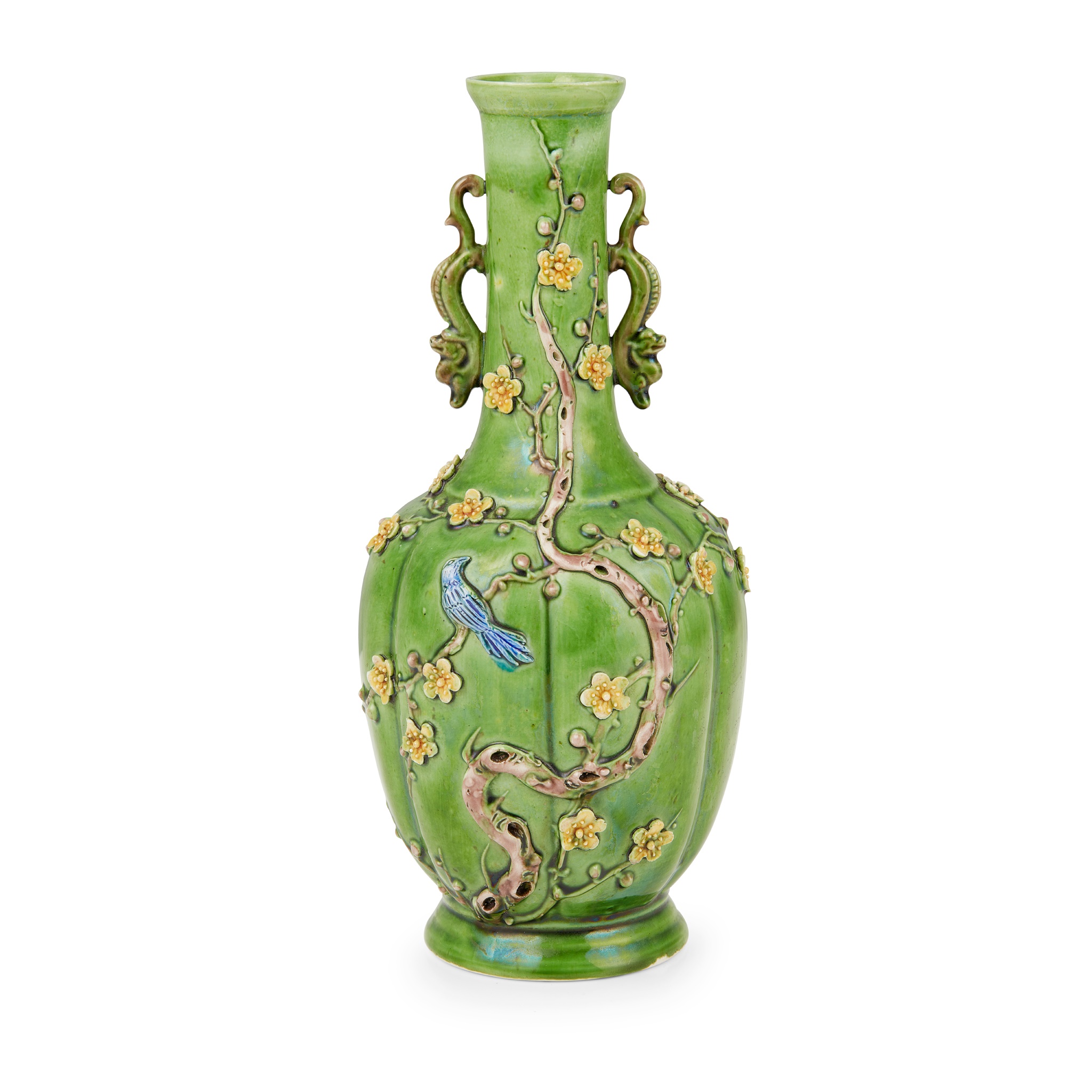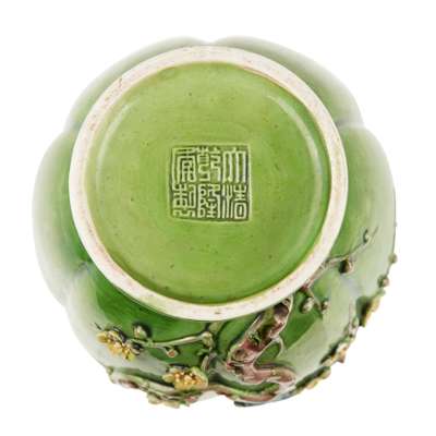 the lobed body supported on a splayed stepped foot, surmounted by an elongated neck with everted rim, the body finely carved in high relief with a magpie perching on a blossoming prunus branch, the neck further flanked with two descending dragons, the decoration highlighted in blue, yellow and aubergine glaze, all against a green-glazed ground, the base impressed with a six-character Qianlong mark
