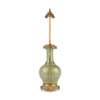 the globular body topped with a stepped-base neck and terminating to an everted rim, the neck flanked by two lion-head handles, the body carved overall with large lotus flowers with tendrils, with brass mounts and transformed into a lamp stand