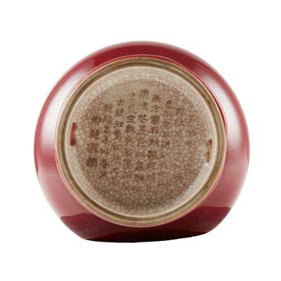 Note: A similar red-glazed vase, dated to the Qing Dynasty, Kangxi period, with inscriptions and Qianlong mark on the base, is in the collection of the Palace Museum, Beijing