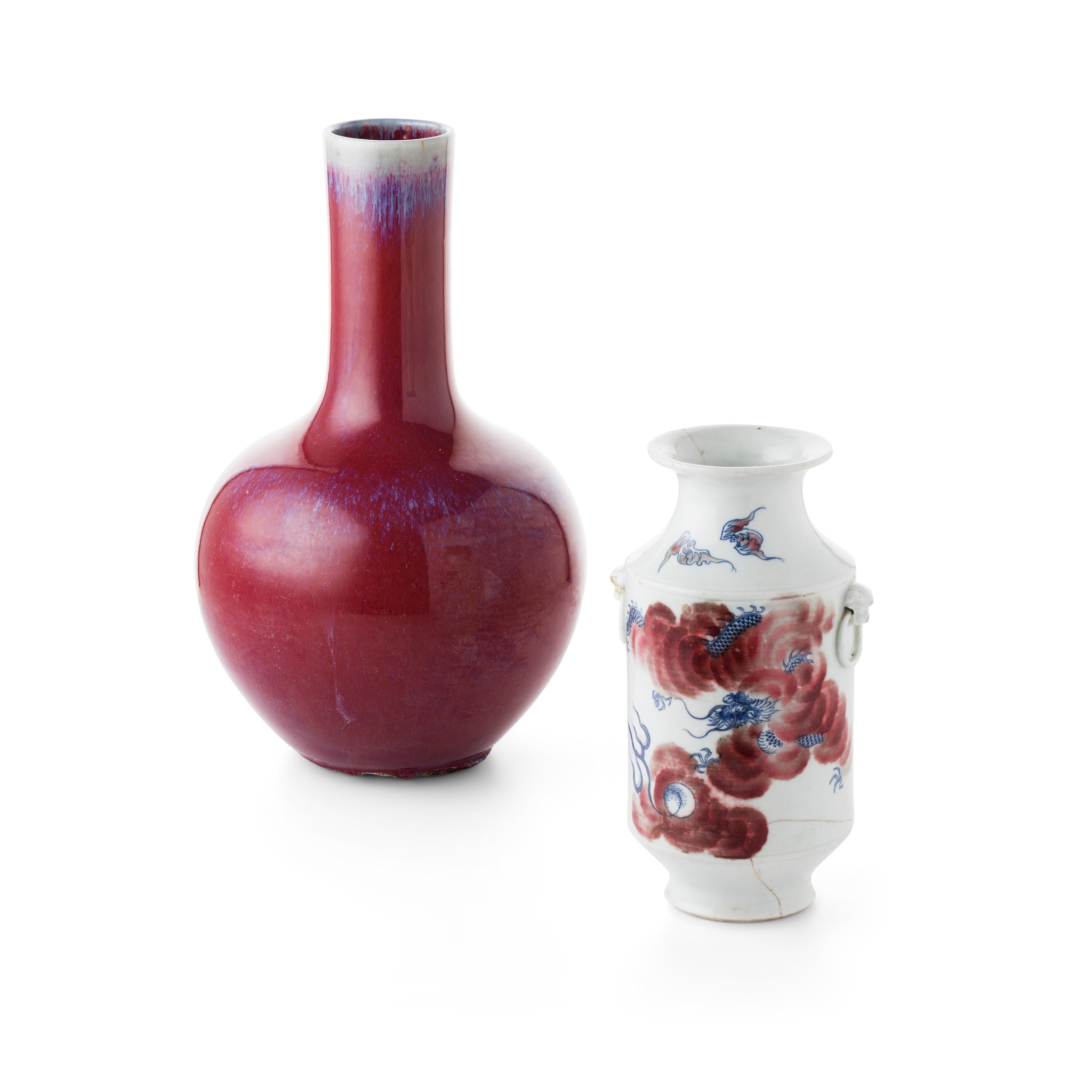 sturdily potted with a globular body and a straight neck, covered overall with an uneven red glaze suffused with lavender and blue streaks; together with a BLUE AND WHITE WITH UNDERGLAZED RED VASE, the cylindrical body painted with a dragon amidst clouds, supported on a splayed foot and surmounted by a waisted neck, attached with two lion-head ring handles on either side of the body, the base inscribed with a four-character Yongzheng mark in underglaze blue
