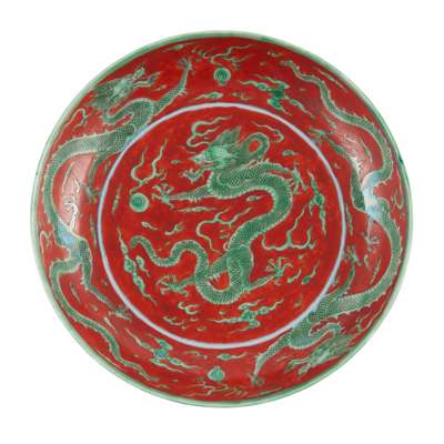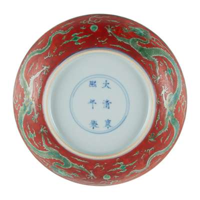 十九至二十世紀 康熙款 礬紅地綠彩龍紋盤