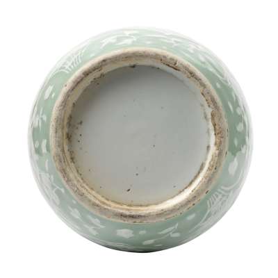LARGE CELADON-GLAZED WHITE-SLIP DECORATED 'CAVALRY' VASE