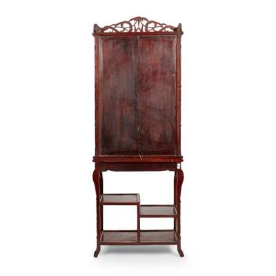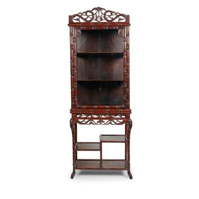 the top with central triangular pediment and side panels carved and pierced with entwined bamboo and leaves, the vitrine glazed door opening to three-tiered wooden shelves, on a separate base with a waisted and splayed apron each further carved and pierced with bamboo on cabriole legs joined by asymmetrical display shelving