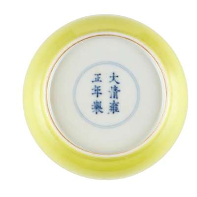 covered overall with lemon-yellow glaze, the base inscribed with a six-character Yongzheng mark in double-circle in underglaze blue
