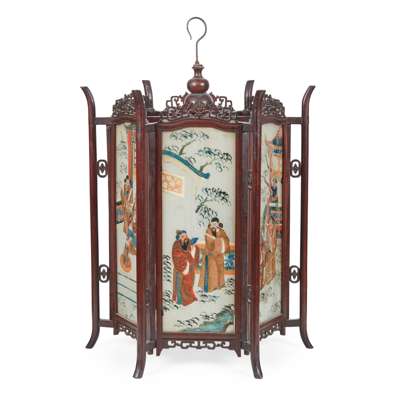 of hexagonal form, five panels reverse painted with figures in gardens, with a double-gourd finial and metal hook
