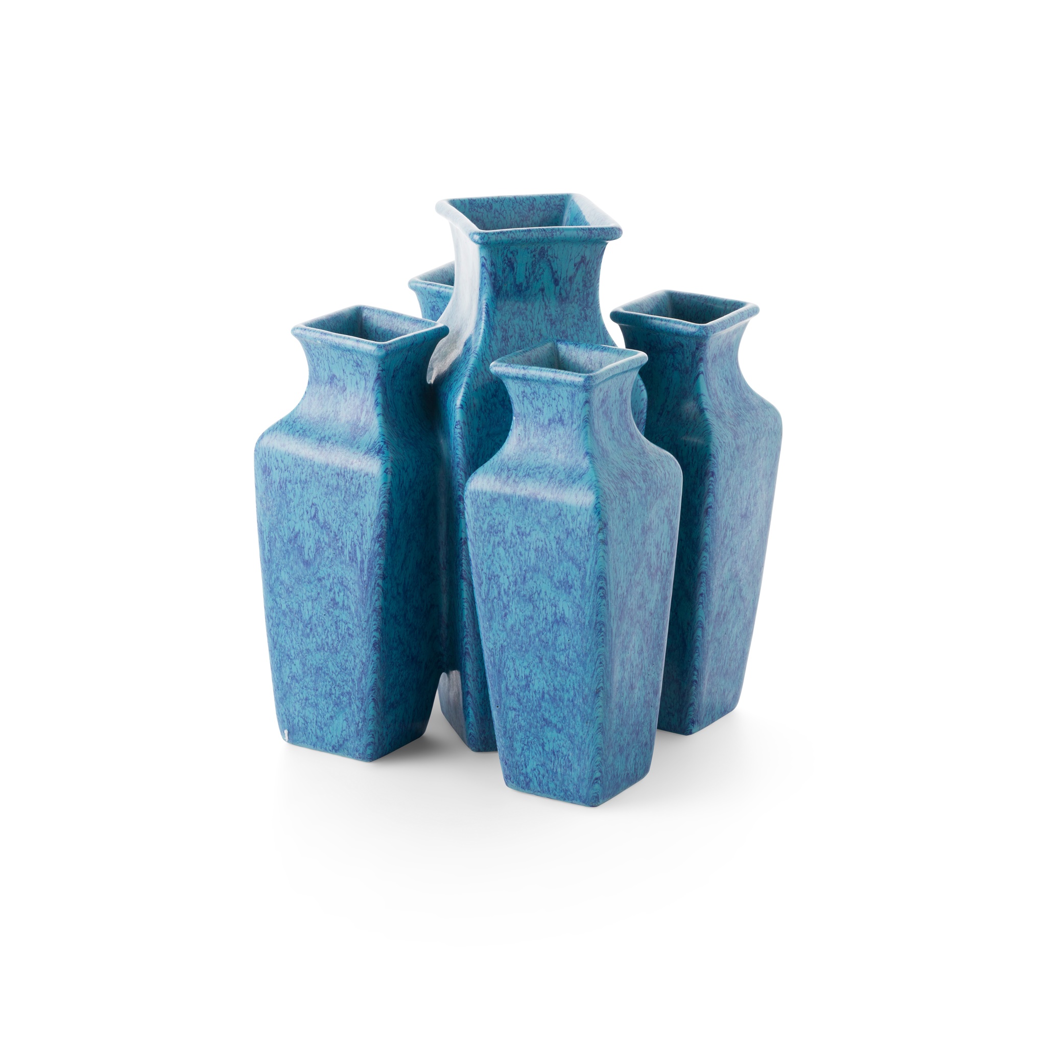 constructed with five square section vases joined together to form a single vessel, four smaller enclosing a larger in the centre, covered overall with a thick turquoise blue glaze suffused with lavender streaks