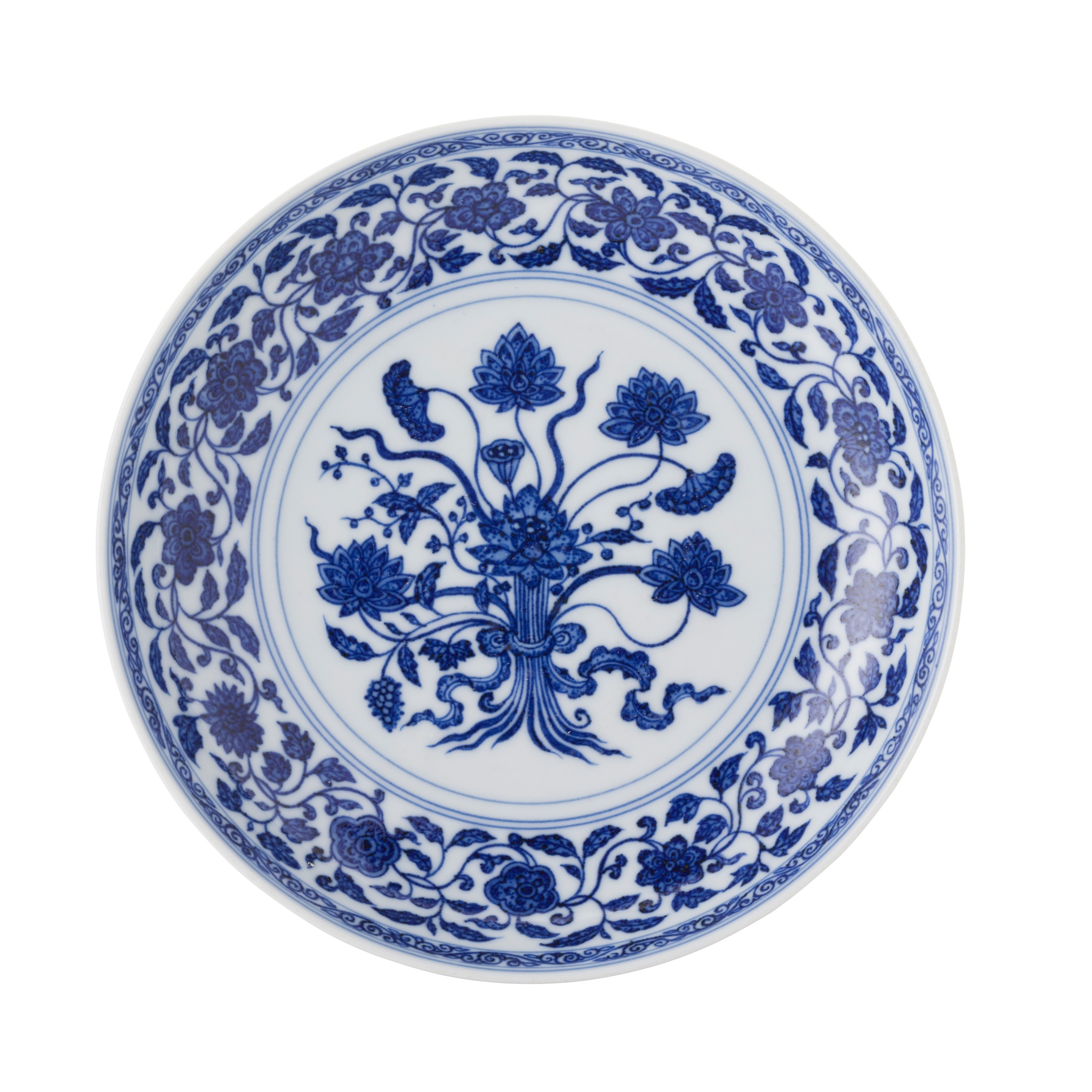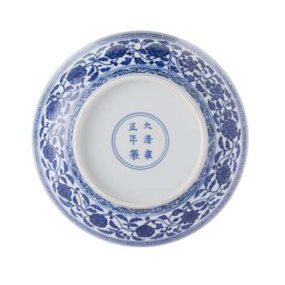 delicately potted, painted to the central medallion with a bouquet of beribboned lotus blooms, enclosed by a band of flower scroll on the cavetto, similarly decorated on the exterior, the base inscribed with a six-character Yongzheng mark within double-circle