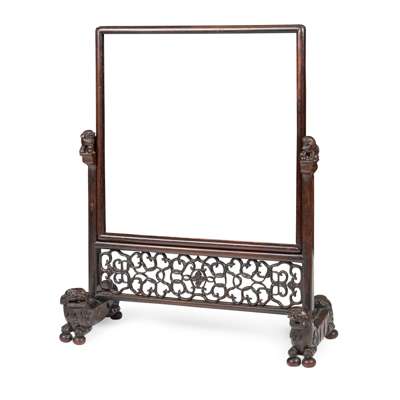 the near square frame inset into an openwork stand supported by two Buddhist lions holding articulated balls in mouths as feet