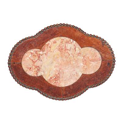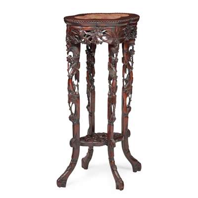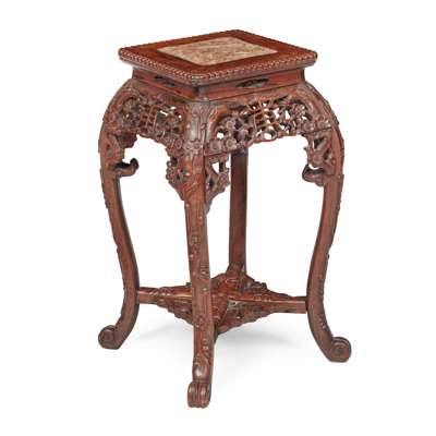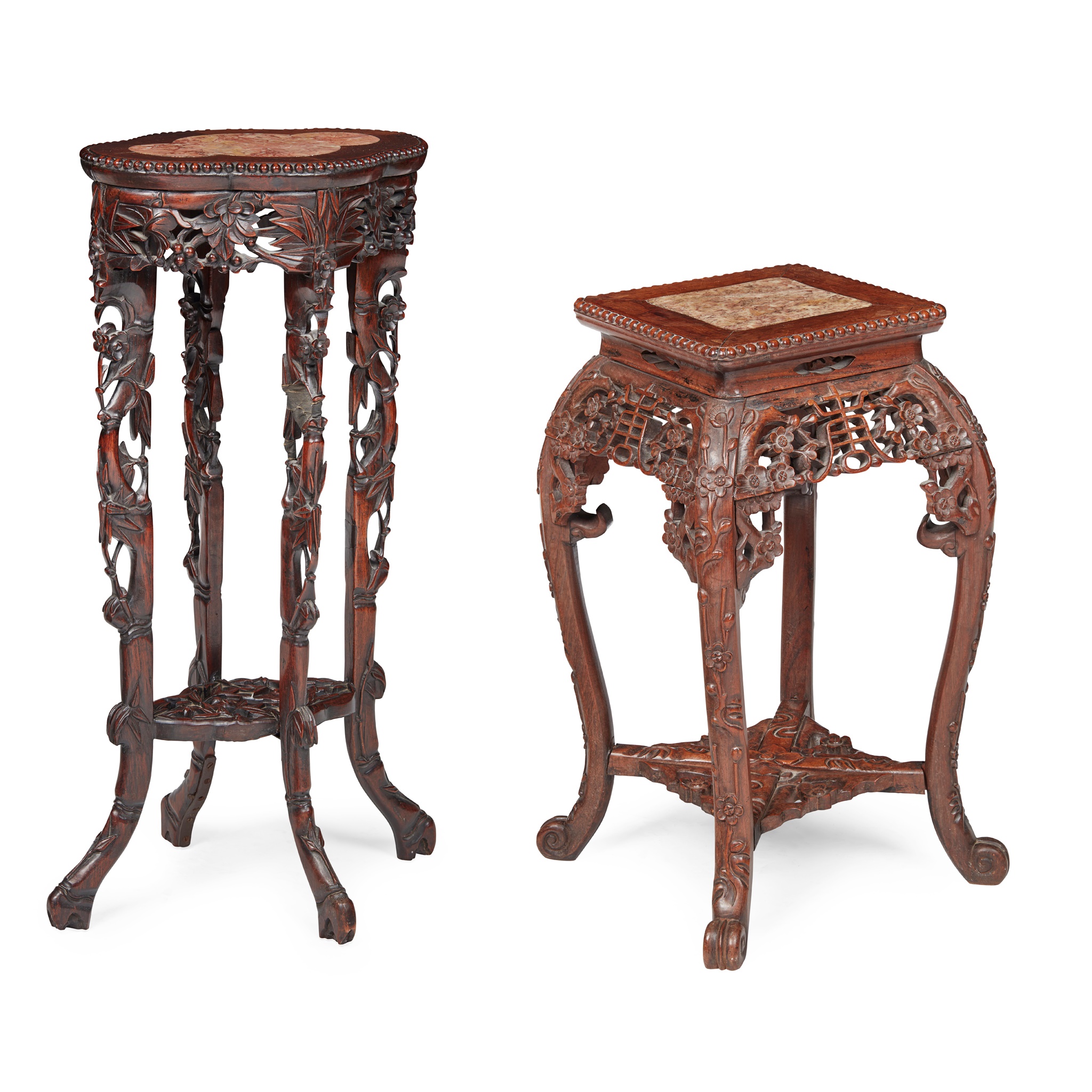 one with quatrefoil rouge marble-inset top above a pierced 'grape' frieze, raised on tapered openwork legs, united by shaped panel stretcher; the other of square form, the top with beaded edges and pink veined marble insert above openwork 'Shou' frieze, raised on carved 'prunus' cabriole legs, united by stretchers