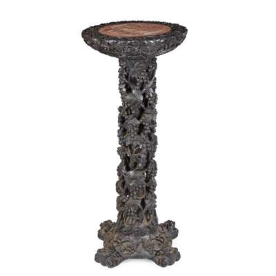 the columnar body raised on domed base supported by four feet, pink veined marble insert the top, pierced and carved overall with grape vines and squirrels