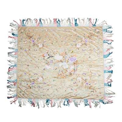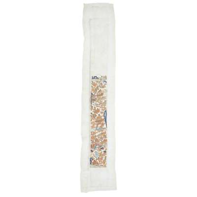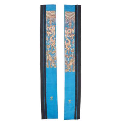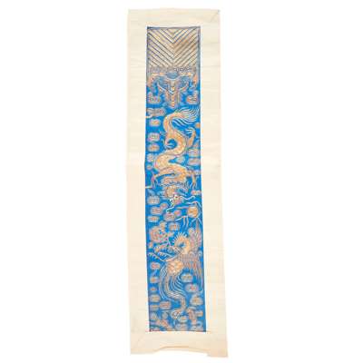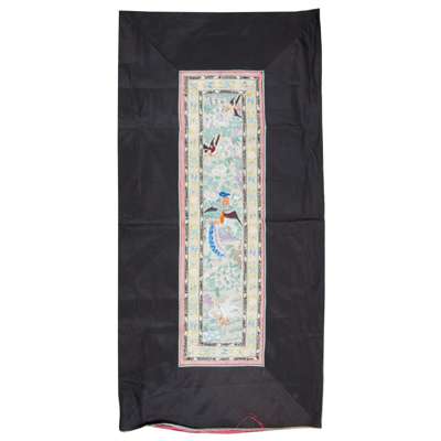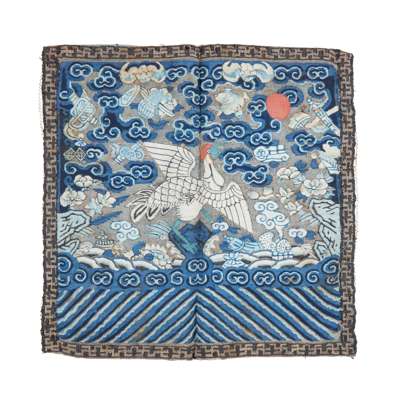 comprising: an official's rank badge, a rectangular silk embroidered sleeve with phoenix; three gold-thread couching sleeves on blue with dragon and phoenix above swirling waves; one multicolour silk embroidered sleeve with landscape with gold-thread borders; a silk blue and multicolour embroidered sleeve with butterflies and flowers; a large table cloth with cranes and flowers