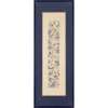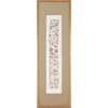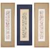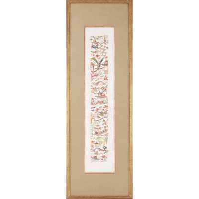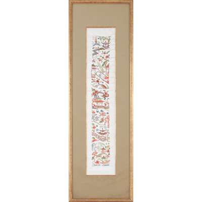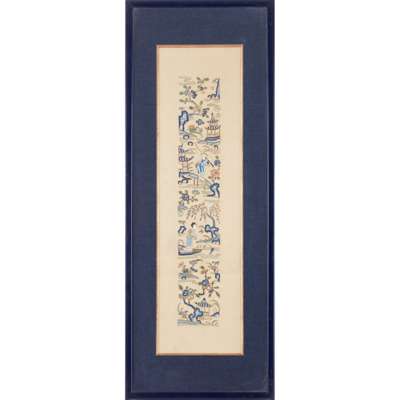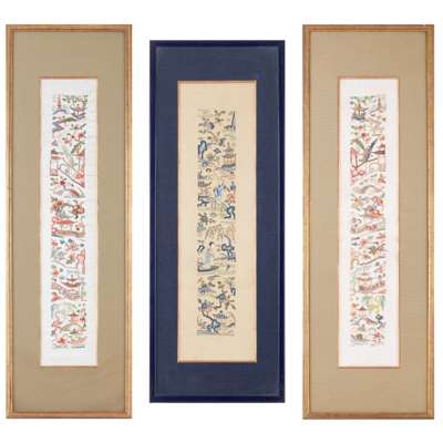 comprising: a pair of ivory ground sleeve bands, decorated in mirror images of a garden with pagoda, sampan and pine tree; and one golden ground sleeve band with blue embroidery of figures in a garden, all framed