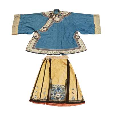comprising: a brocade blue ground lady's robe, the hem and collar with figural embroidery; and a yellow ground pleated skirt, embroidered in the main panels with peonies issuing from vases, further panels with flowers and butterflies