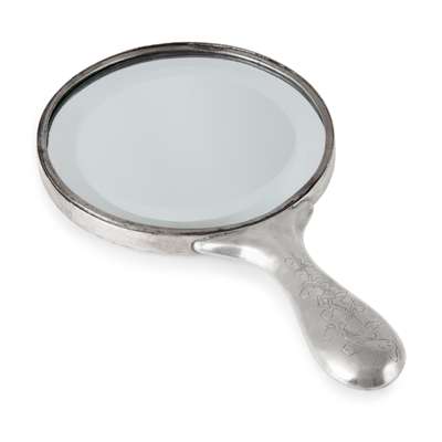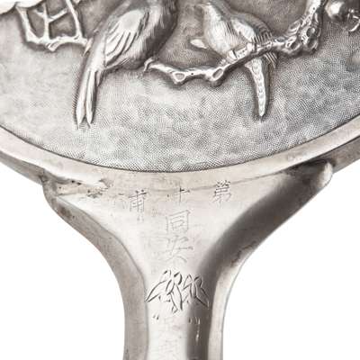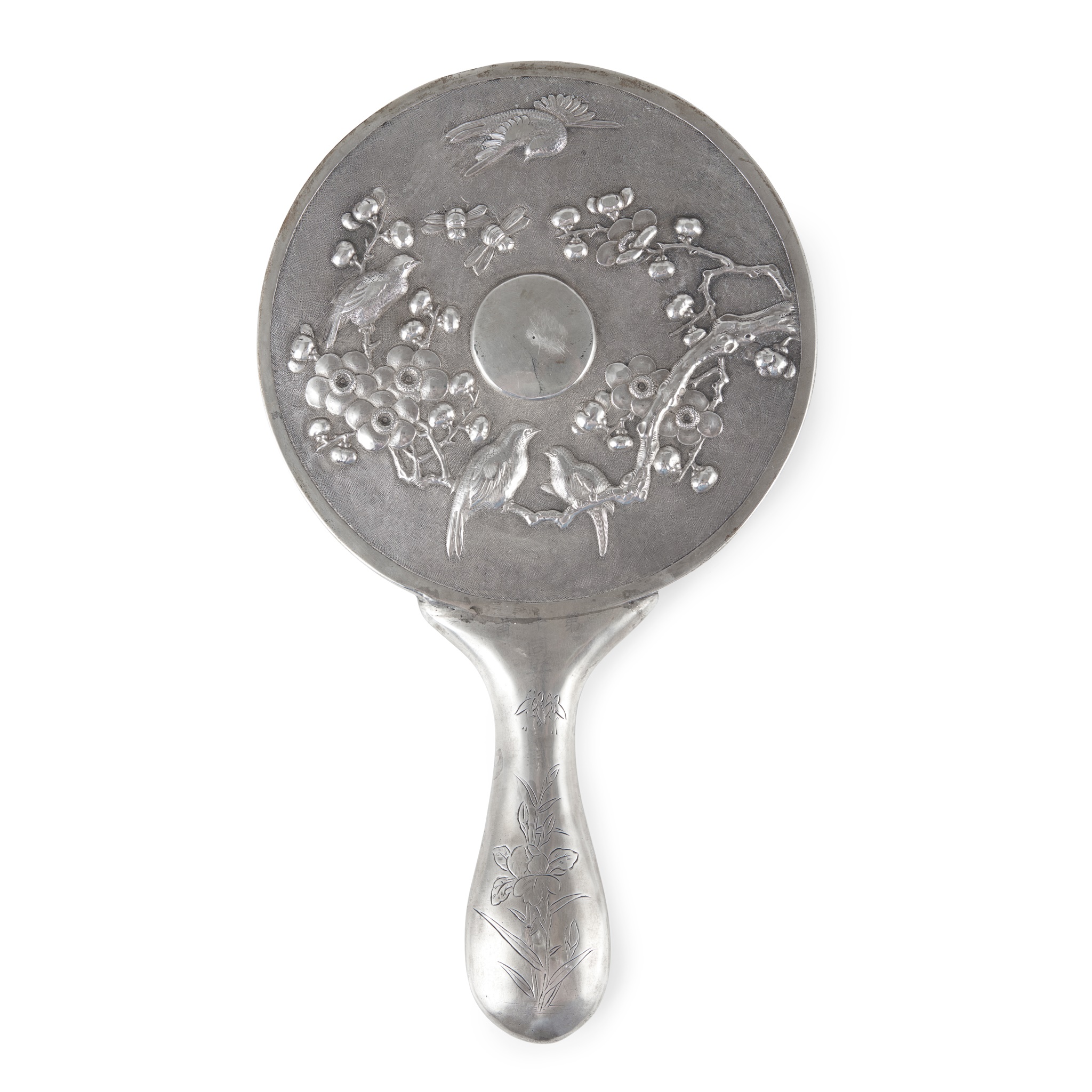 comprising: a hand mirror, the back decorated in relief with birds perched on prunus branches, the handle incised with flowers and finely chiselled with inscriptions 'Di Shi Fu, Tong An, Zu Yin' (No. 10 Fu Road, Tong An, pure silver); together with a pair of chopsticks bound by a chain, each with the upper part incised with bamboo leaves and pomegranates, with 'Zu Gen' (abbreviation of Zu Yin, pure silver) mark
