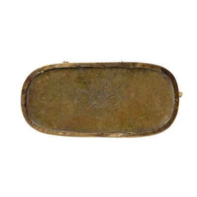 the raven-faced Mahakala cast standing in alidhasana trampling over a female corpse, holding kartika in the right hand, kapala on the left hand in front of the chest, skull crown above wrathful face, backed with upward flame-like hair, all above a lotus pedestal, the base sealed with a plaque incised with double vajra