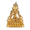 shown seated in padmasana, both hands in vitaka mudra with the right one half raised before the chest, and the left hand resting on the knee, wearing a five-leaf crown surrounding a high chignon, heavily jewelled, a billowing scarf wrapped around his front hands resting on the sides of his thighs, the base unsealed