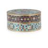 of circular form with straight sides, the cover delicately enamelled with lotuses in tendrils, all against a light blue turquoise ground, the sides of the cover and the box similarly decorated with continuous flower heads respectively against dark blue and light blue grounds, the base covered in gilt and carved with a six-character Jiajing mark in one line