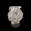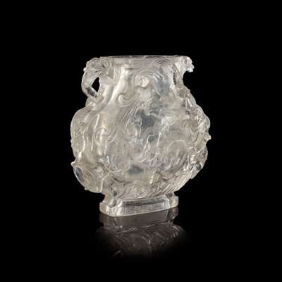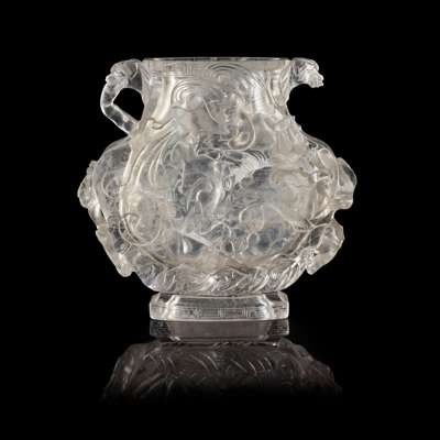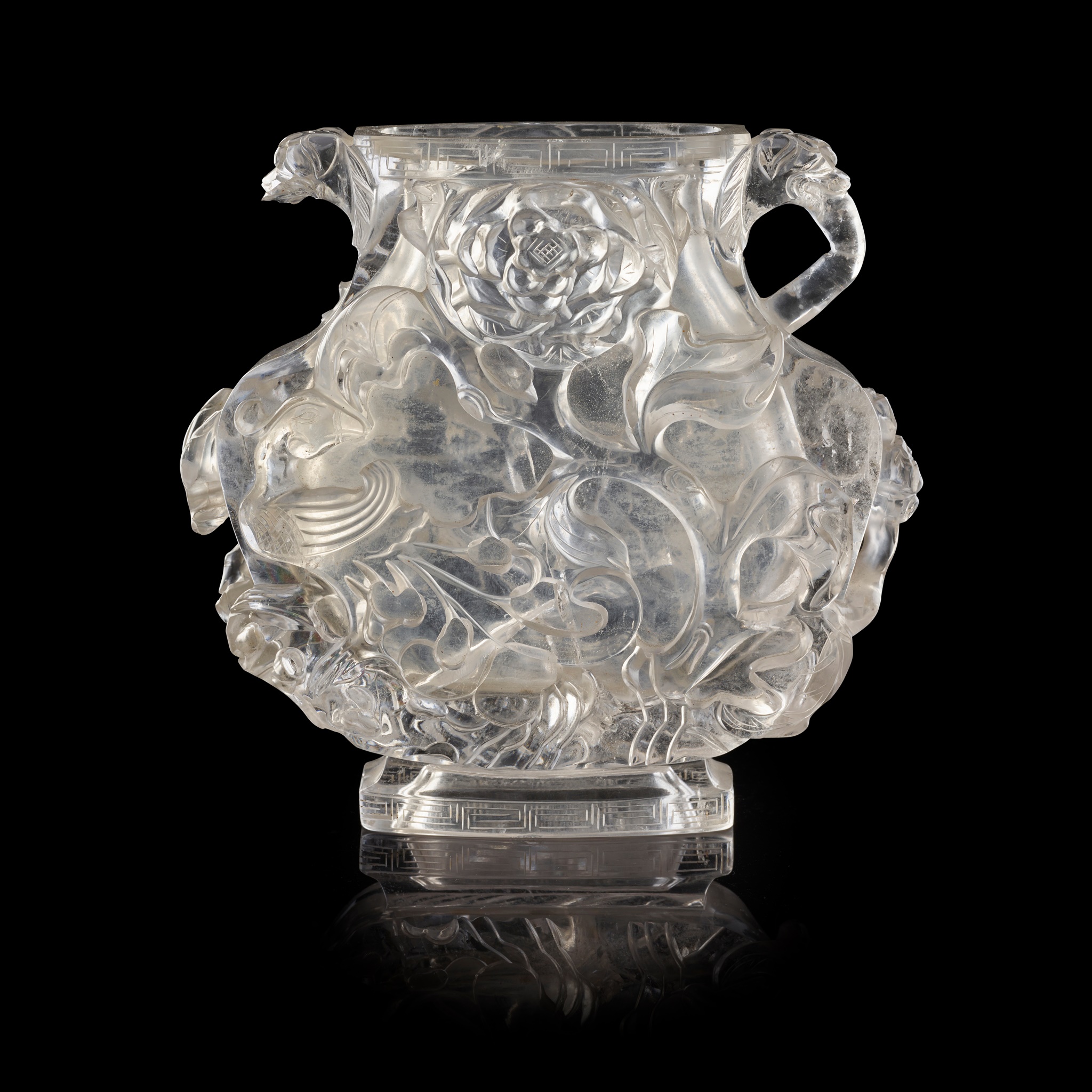 of flattened form, carved in mid-relief on both sides with phoenixes and a large peony near the mouth, the waisted neck flanked with mythical beast-headed loop handles