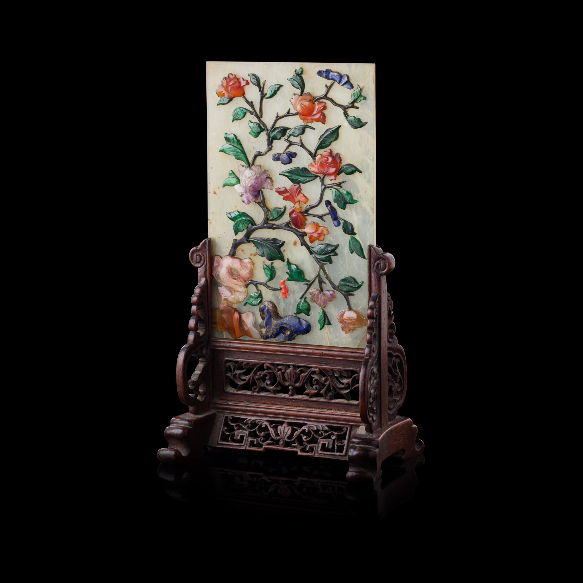 decorated to one side with various coloured hardstones with a flowering tree issuing from rockwork on lower left, inset in a carved wooden stand