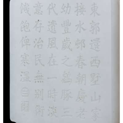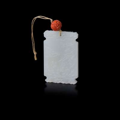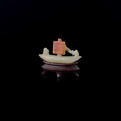 comprising: a pierced 'abstinence' white jade plaque, 6.7cm high; a white jade plaque carved with Imperial Poem on one side, the other with two figures in a shanshui landscape, 6.1cm high; and a pale celadon jade carving of a sampan with two figures, cleverly leaving the russet 'skin' on one side of the sail, on a carved wooden stand, 6.6cm wide