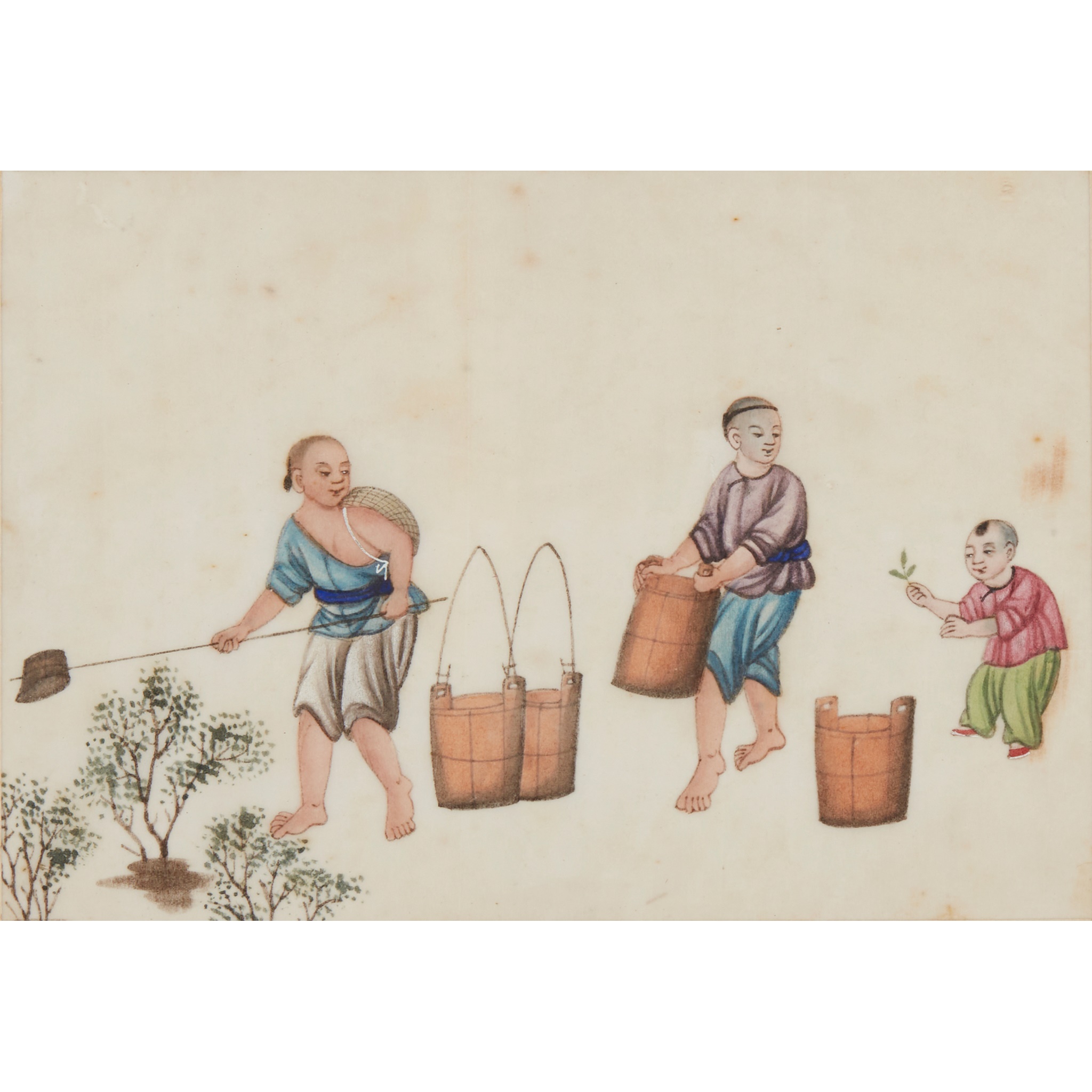gouache on pith paper, four vertical depicting various professions, and two horizontal depicting the production of tea, all framed