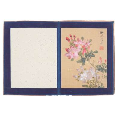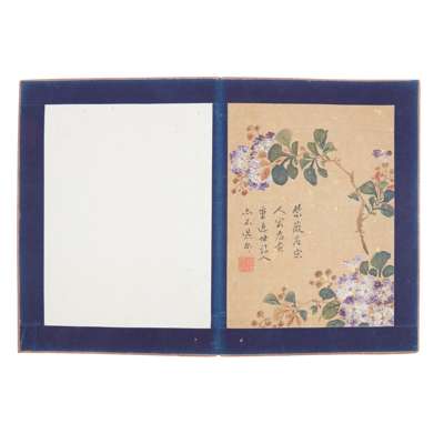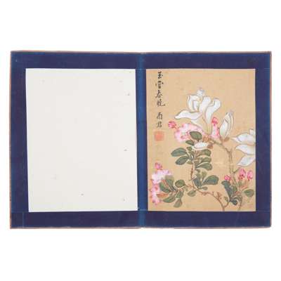 comprising twelve paintings on paper with gold leaves, featuring various types of flowers, with a wooden cover at one end