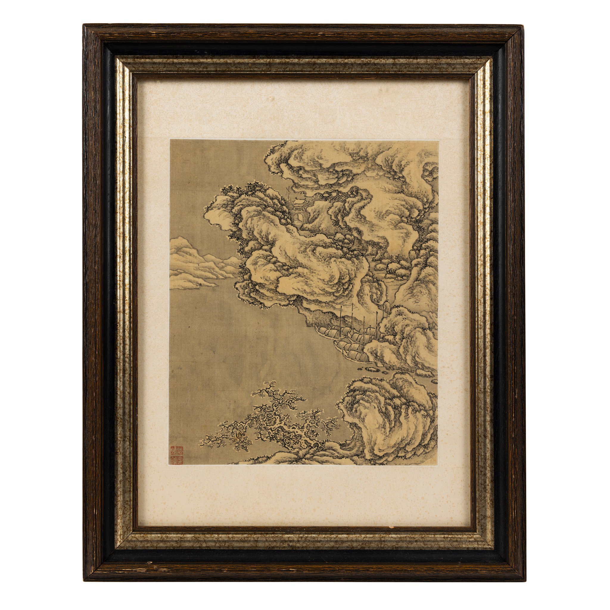 ink on silk, depicting a building discreetly tucked in a mountain, framed