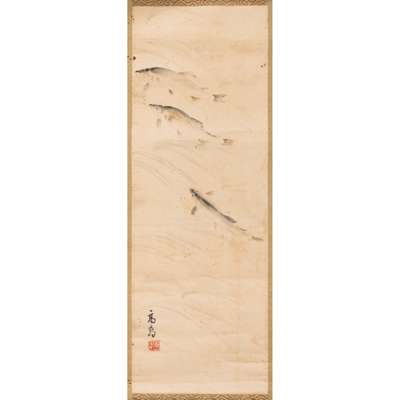ink and colour on paper, depicting three fish, signed 'Gao Weng' and sealed 'Qi Feng' on the lower left