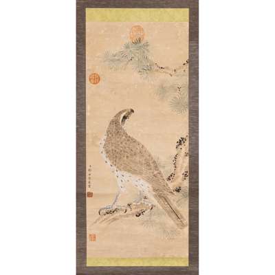 comprising: ink and colour on paper depicting hawk, signed and sealed of the artist, further appraisal seals, mounted as a hanging scroll; and an ink and colour on silk depicting wildflower, inscribed upper right with a poem, signed and sealed of the artist, mounted as a hanging scroll