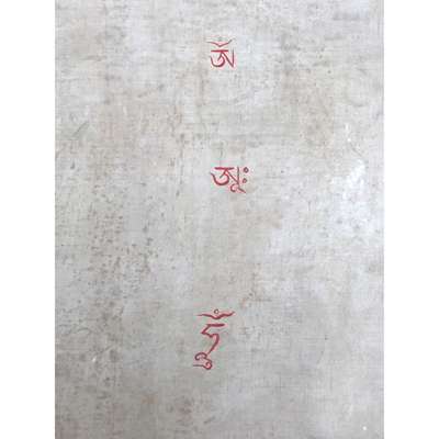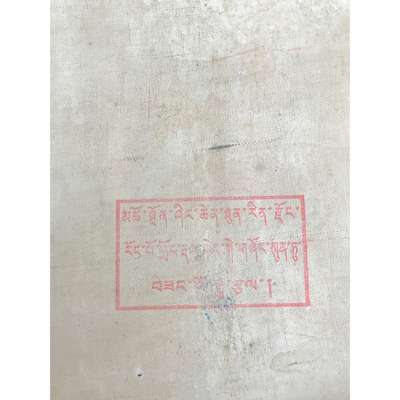 distemper on cloth, shown seated in dhyanasana on a single lotus throne, right hand raised in karanamudra holding an upright vajra, left hand holding a ghanta before the abdomen, billowing scarfs wrapped around her shoulders and arms, decorated with elaborate bracelets and armbands, large earrings flank the serene face, crowned, enclosed by natural surroundings with turquoise sky, verso inscribed and sealed