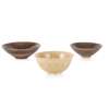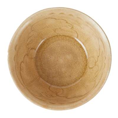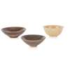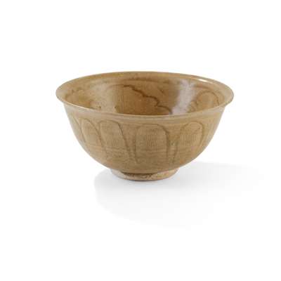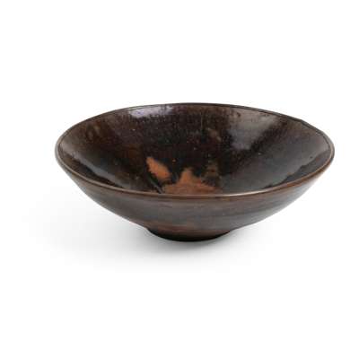 comprising: a Jian-style teabowl, Song dynasty, potted with steep sides, applied overall with a black glaze with russet network of crackles on the exterior, the interior with dark streaks radiating from the central rosette medallion, the glaze stops irregularly near the foot exposing the dark brown buff body; a Henan Tianmu Brown-glazed teabowl, Song dynasty or later, well potted with steep sides rising from a short foot to a brass mounted mouth rim, covered overall save for the foot rim with a rich and glossy dark brown glaze, liberally splashed with silvery-brown streaks, the unglazed foot rim revealing the brown stoneware body; and a Longquan yellow-glazed teabowl, Northern Song dynasty, sturdily potted, rounded sides, everted rim, carved with flower petals on the exterior, cloud-like motif in the interior, applied overall save for the foot and base with golden-yellowish glaze suffused with fine craquelure, the base inscribed
