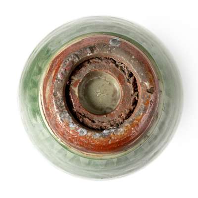 the ovoid body supported on a stepped foot, tapering to a high shoulder and cylindrical neck, terminating to an everted mouth rim, a raised ridge encircling the foot, centre of the body, shoulder neck, the body and lower part of the neck carved with floral decoration, a band of triangular pattern above the foot, overall covered in an olive-green glaze and leaving only the foot unglazed, showing the orangy-brown stoneware body, the unusual 'double' bases and the ridge interior revealing the existence of a smaller inner vase