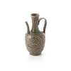 the ovoid body carved with four leafy flowering peony stems above a lotus band on the foot, the waisted neck with plantain leaves, set on one side of the shoulder with a curving spout, the reverse a strap handle, covered overall with a dark olive-green glaze