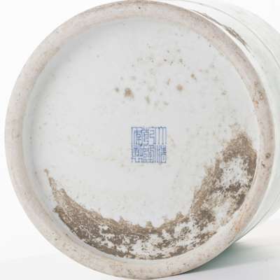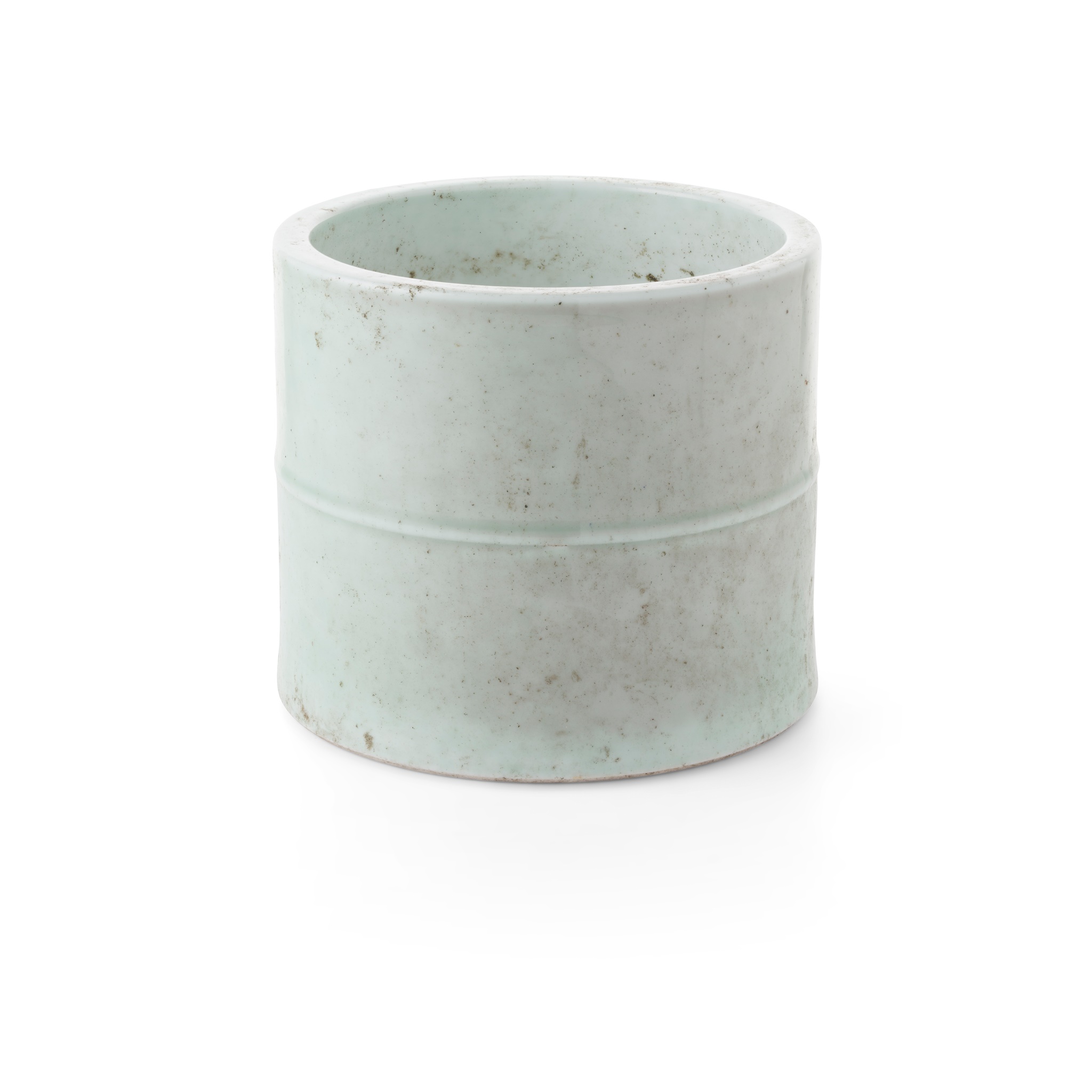 of cylindrical form, middle of the body with a horizontal rib, applied on the exterior with a pale celadon glaze, the base inscribed with a six-character Qianlong mark