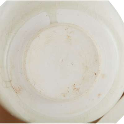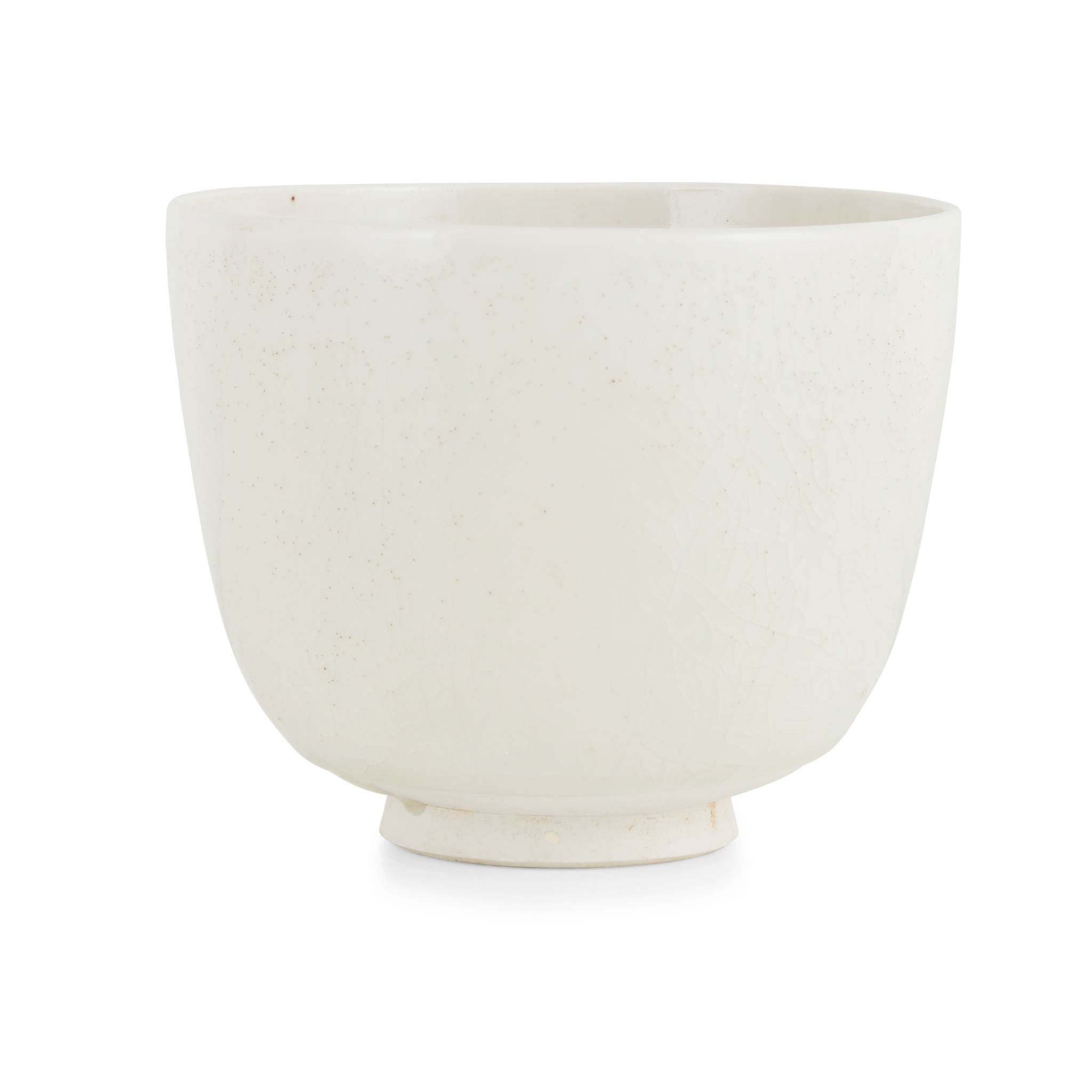 sturdily potted of deep U-shape, supported on a low flaring solid foot, covered overall in a transparent glaze suffused with crackles, stopping neatly above the foot to reveal the white body