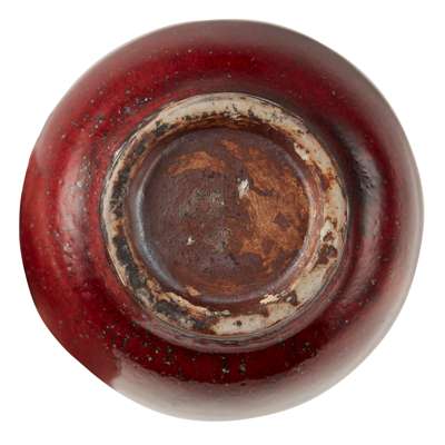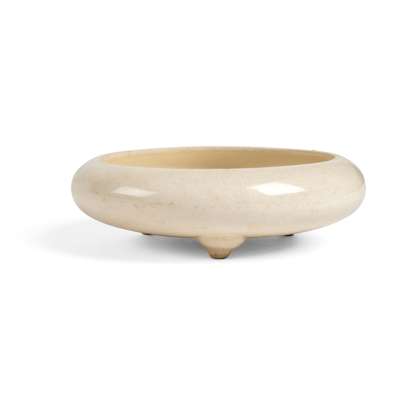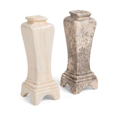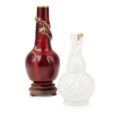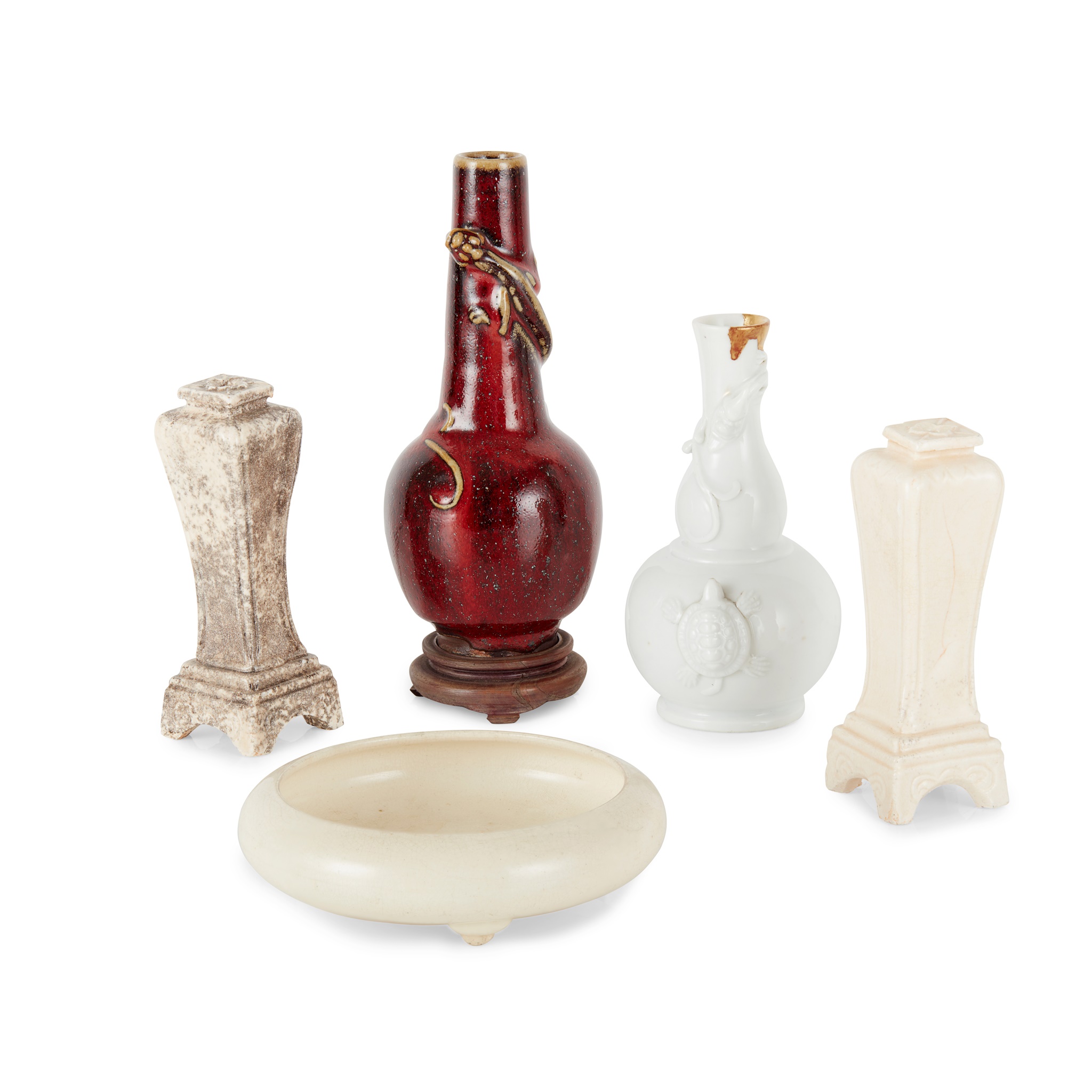 comprising: a red-glazed bottle vase, moulded with slender chi-dragon coiling on the long cylindrical neck, with a fitted wooden stand, 16.7cm high; a Dehua double-gourd vase, moulded in relief with a tortoise on the lower bulb and a sinuous chi dragon above the upper bulb on the waisted neck, the base with an obscure mark in a panel, 13.4cm high; two Dehua incense holders, each finely moulded on a tall stand, the square-column body extended toward a wide shoulder, terminating to a square top adorned with a four-petal flower in relief, 11.8cm high each; and a white-glazed tripod brush washer, of compressed globular form, supported on three cabriole feet, covered overall with a white glaze with ivory tinge and a fine network of craquelure, 12.5cm diameter
