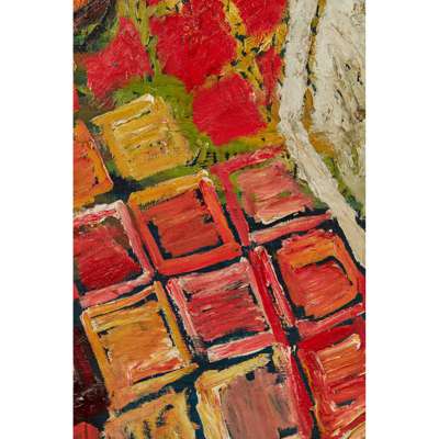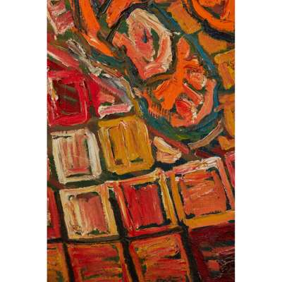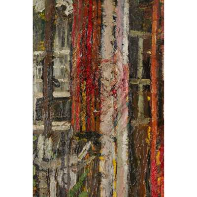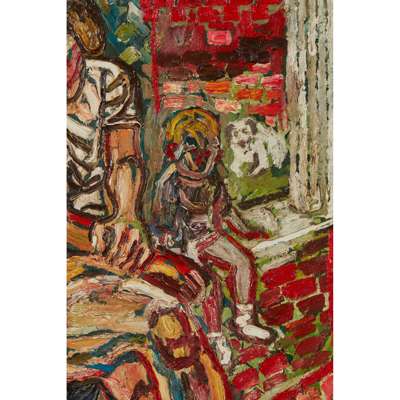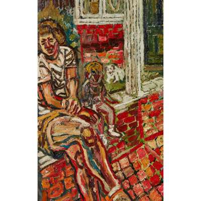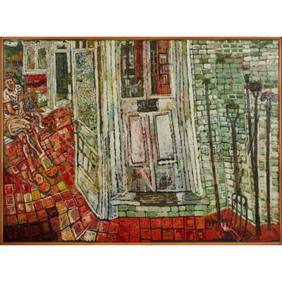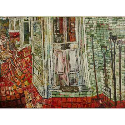 The present work is part of a group of paintings associated with the film and the following solo exhibition which was held in New York at The French Gallery on 987 Madison Avenue; Bratby's first in New York. It bears close similarities with the piece ‘The Greenhouse’, sold in Christie’s in 2020. It is on the large scale typical of this period, and features the artist’s trademark lurid colour palette, heavy impasto and focus on the textures and patterns of the urban and architectural environment; from the red terracotta floor tiles to the bricking of the terrace walls, which take compositional precedence over mother, child and dog seen receding into the left of the painting. It is perhaps no wonder he attracted the attention of a film producer, as his work has a strikingly cinematic, almost fisheye lens panoramic perspective.