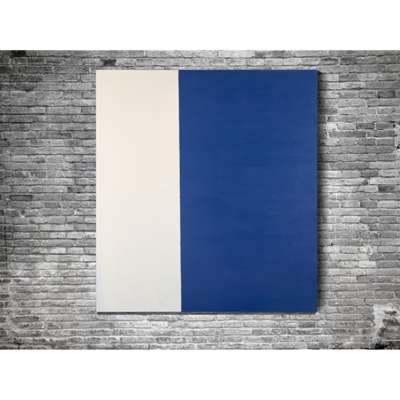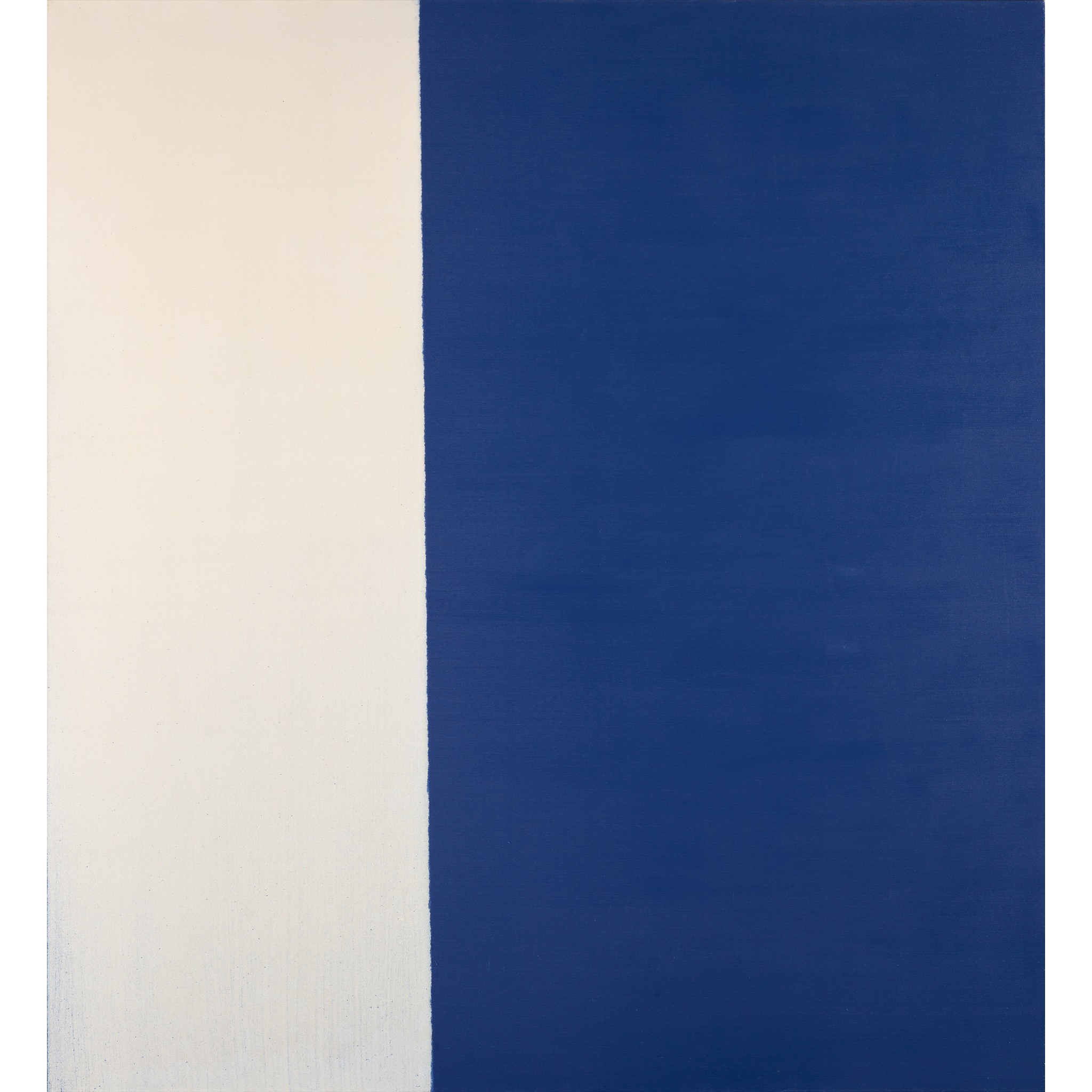 Painted in the typical large format that characterises this series (apparently selected as it is the span of the artist’s arm), it features a block of pure highly saturated blue, the striations of Innes’ gestural brushwork visible upon scrutiny. The year 1995 saw the artist meditate on the minimalistic juxtaposition of just two tonal fields, in this case Paynes Grey and Cobalt Blue, meeting in a feathery, bleeding intersection. Though graphic, indeed almost stark, nothing is ever quite what it first seems with a work by Innes. “Everything that pertains to be minimal of course is not,” he once commented. “The way the eye works, it goes to the painted area, then the white, then the feathering. Something simple becomes complex.”