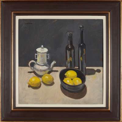 STILL LIFE WITH BLACK BOTTLES AND LEMONS