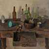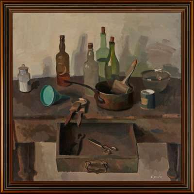STILL LIFE WITH BOTTLES AND OPEN DRAWER