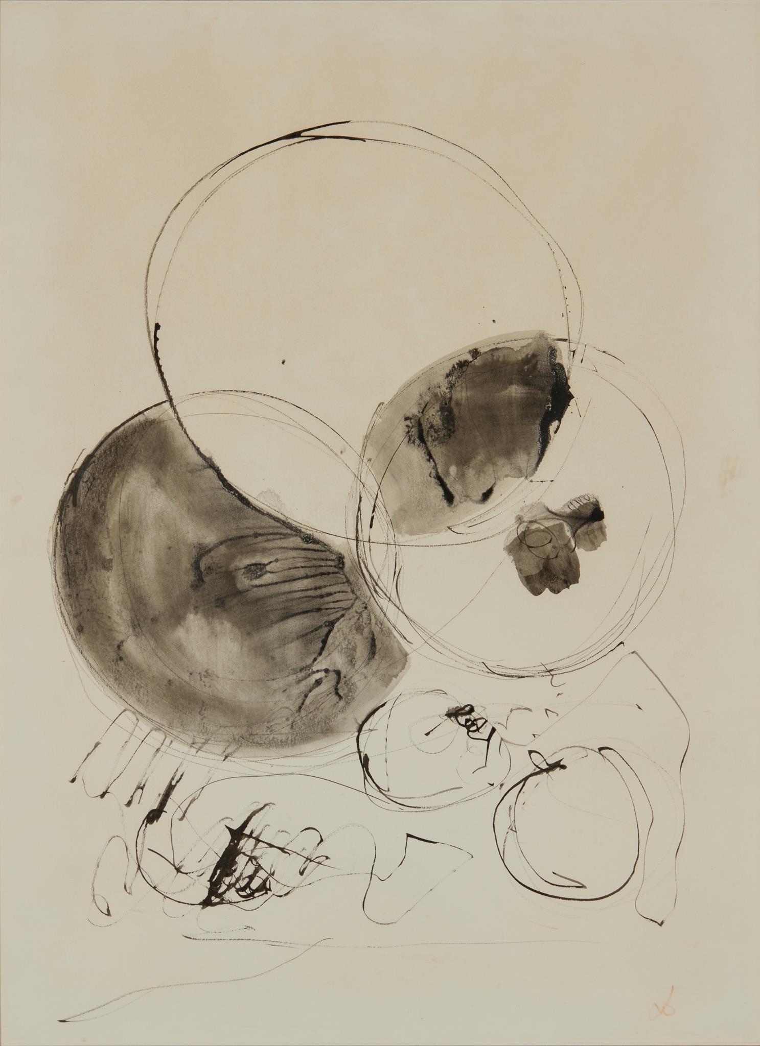 Signed faintly with initials in red pen lower right, ink on paper