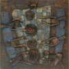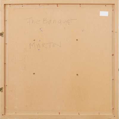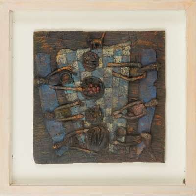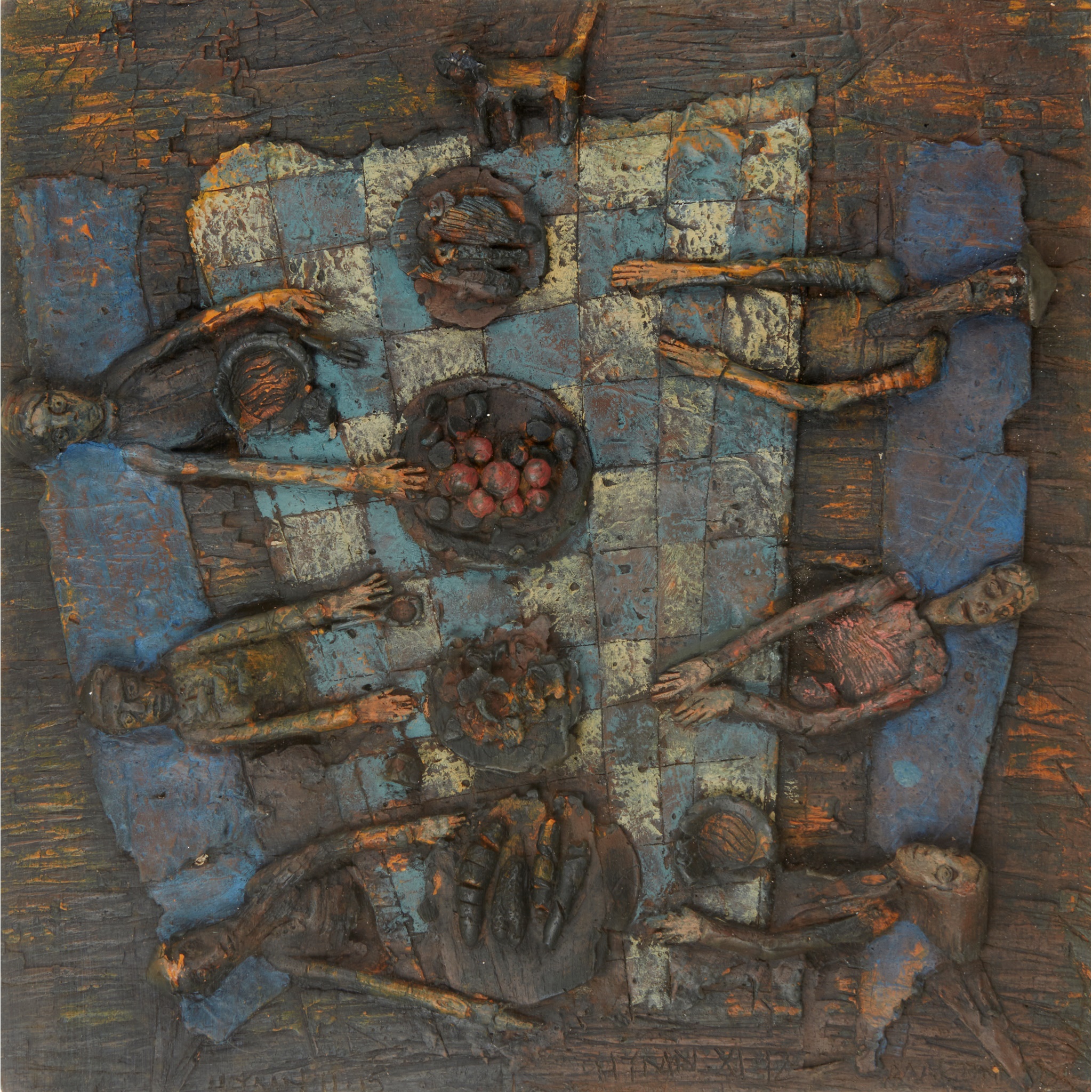 Signed lower right, inscribed 'Hymn 11.15. Hymn XI 12,' inscribed to backboard, painted clay relief