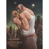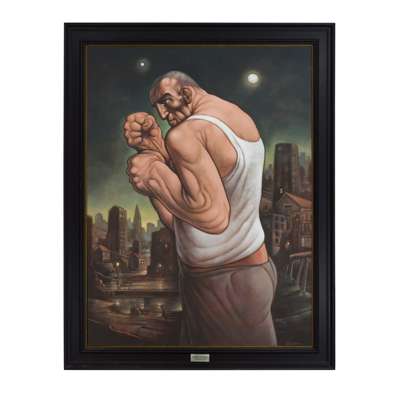 Our boxer is lit with an almost supernatural glow, an actor on a stage, his surroundings more a backdrop. He is of the city, but in this particular moment, seems to stand outside it. In the sky there are two points of similar bright light – the moon and the North Star, lending this work an air of mystery, an unspoken narrative twist, a meditation, perhaps, on action and destiny.