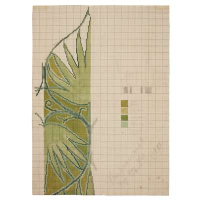 graphite and watercolour, depicting palm leaves, on gridded paper, inscribed with colour scale, signed with initials and inscribed CFAV/ THIS PATTERN MUST BE KEPT VERY FLAT, signed and inscribed verso C.F.A. VOYSEY ARCHT./ 6 CARLTON HILL N.W./ JULY 1898 and for 4/1600, bears printed Tomkinsons Carpets Ltd. stamp, no. V000068