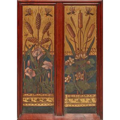 walnut, with gilt embellishment, polychrome painted panels inscribed SUMMER and AUTUMN, and incised decoration