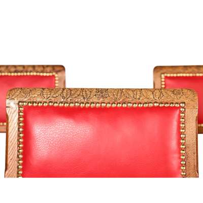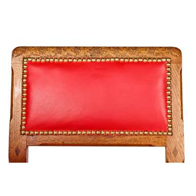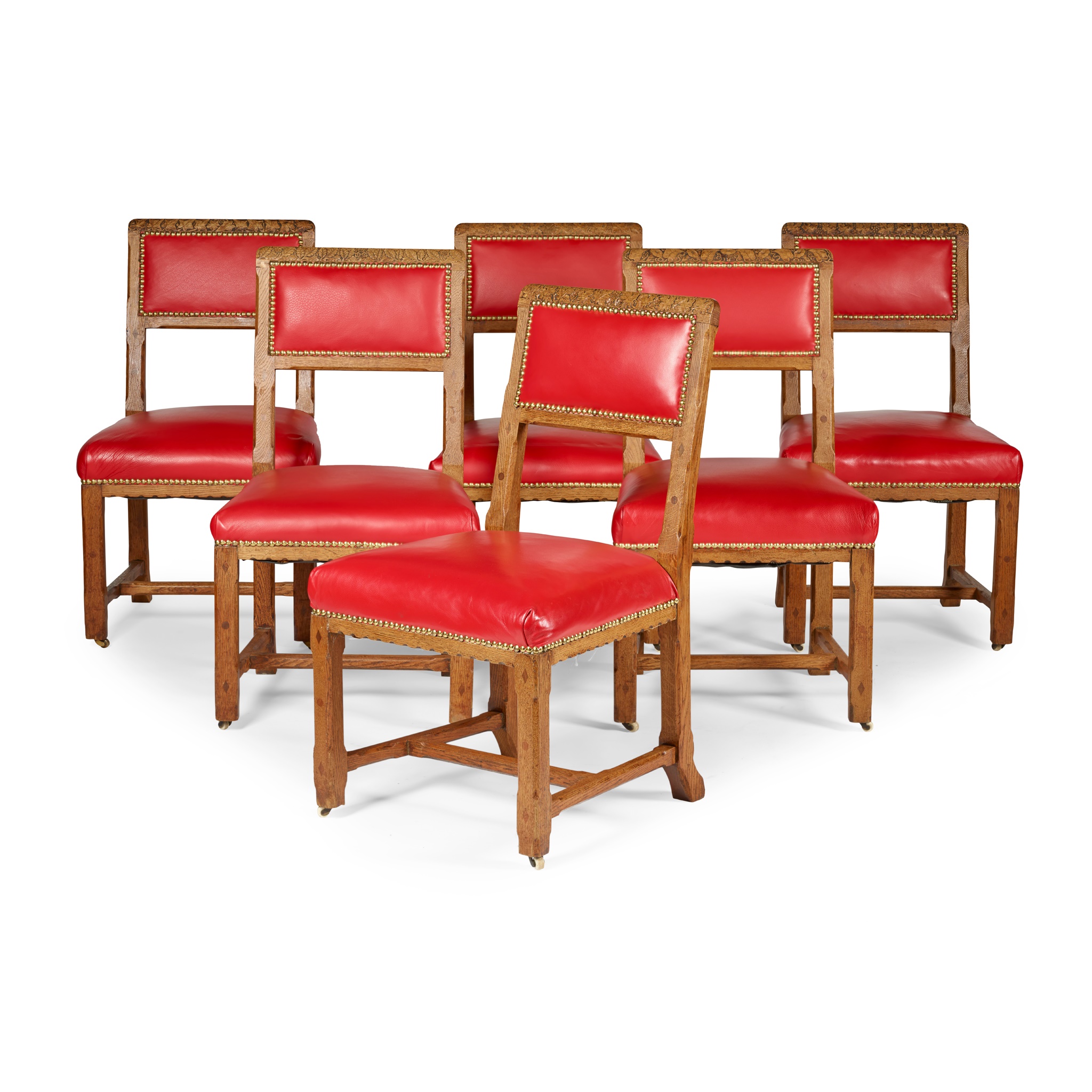 Note: The Paper Buildings comprise a set of barrister’s chambers situated within the Inner Temple area in London. Initially built in 1609, the name refers to the construction materials used in the buildings, a combination of timer, lath and plaster, known as ‘paperwork’. In 1819 Robert Smirke was surveyor of the buildings; his only work in London that was executed in the Gothic Revival style, notable rooms include the Library and the Great Hall. However, the buildings’ history was plagued by a number of fires which destroyed large portions of Smirke’s work. The Library and Great Hall were rebuilt by Smirke’s brother Sydney in 1870, very much in the Gothic aesthetic; today the paper buildings resemble a far more modern aesthetic, with elements of neo-classical architecture after further renovations in the 1950s. The present set of six chairs, originally with green leather upholstery, certainly bear similarities with much of the seating produced for the Palace of Westminster, namely the chamfered square legs with recessed H-stretchers, completed in oak. The chairs each bear a distinct carving along the top rail and while Pugin’s designs were generally dominated by plain and solid construction, designs for the Palace of Westminster often featured more elaborate embellishments and intricately carved details. In 2006, a pair of X-frame side chairs, attributed to Pugin for the Palace of Westminster, feature similar carvings of oak leaves and acorns; a dining chair for the Speaker’s House, on display in The Metropolitan Museum in New York, also displays similarly carved flowering foliage (accession 2015.638). A chair matching the design of the present lot, carved with holly on the top rail with original green leather upholstery, still resides at the Three Paper Buildings Barristers in London today.