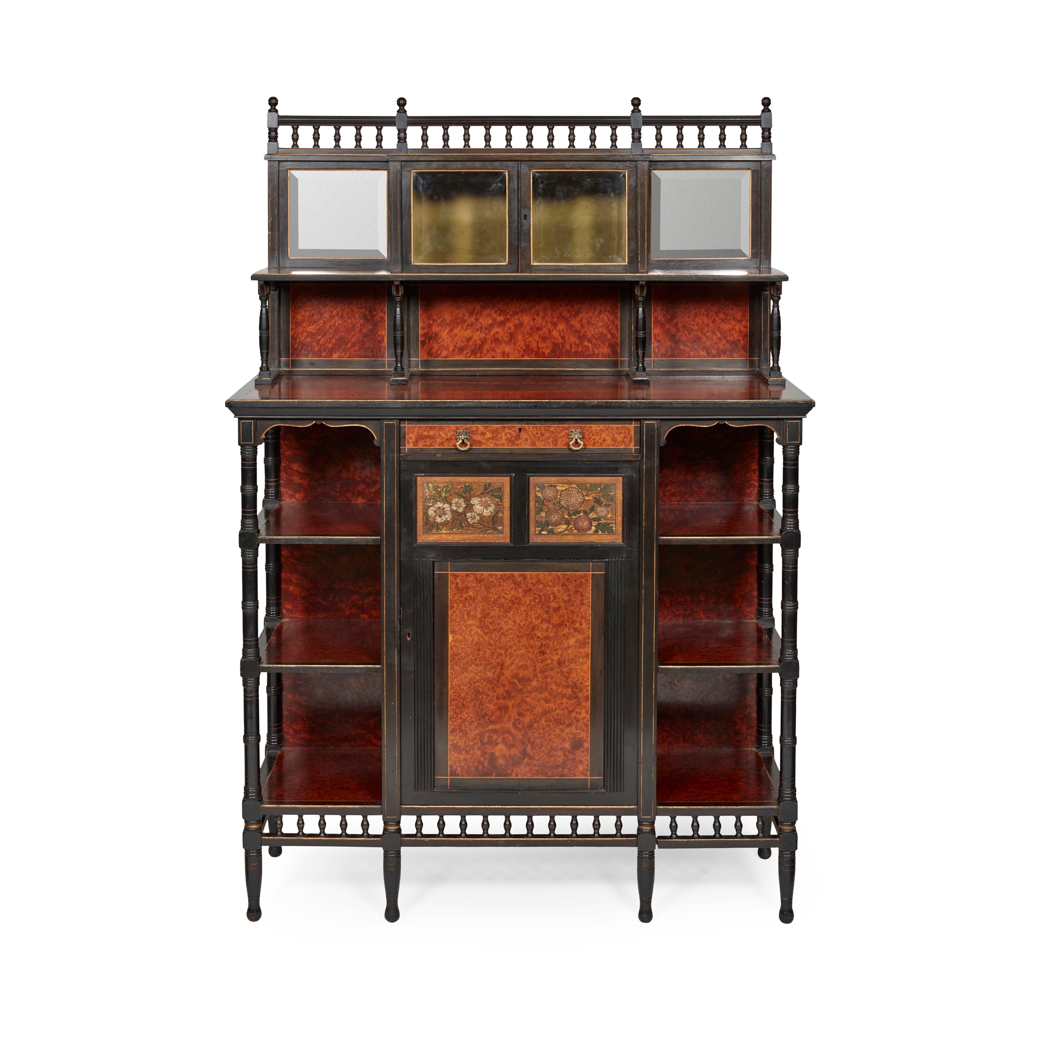 amboyna and ebonised wood, inlaid with boxwood and with gilt embellishments, painted panels, bevelled clear and mirrored glass