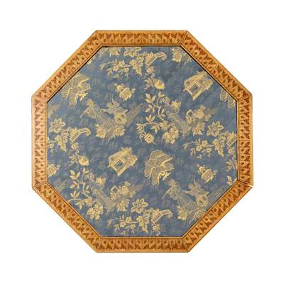walnut, with mahogany inlay, woven silk and brass capped legs