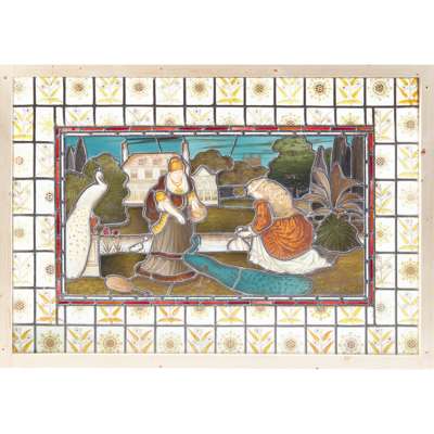 Note: The artist, designer, decorator and art dealer Daniel Cottier (1838-1891) is acclaimed for his creative exploitation of the building and decorating boom of the late 19th century and his entrepreneurial founding of an intercontinental business empire in response. Cottier was born and raised in Glasgow, the ‘second city’ of the British Empire, where he established a reputation as an accomplished stained glass designer and business owner and soon became one of Scotland’s most innovative decorators. Encouraged by his growing success, Cottier founded ‘Cottier & Co.’ in London in 1869 with one of its specialities being the design and manufacture of stained glass in churches, public buildings and private homes. In the following decade, Cottier’s glass palette was increasingly marked by the richer and darker colours associated with the Aesthetic Movement, of which he became a key exponent. The peacock, sunflower and lily became popular adornments of ‘The House Beautiful’ during this artistic period, and feature prominently in Cottier’s glass designs. In particular, the peacock became a prevailing icon of the Aesthetic movement for its colour and splendour which perfectly matched the movement’s goal to produce and experience “art for art’s sake”.
